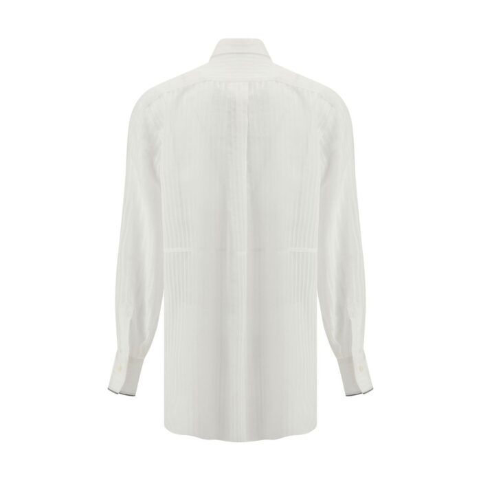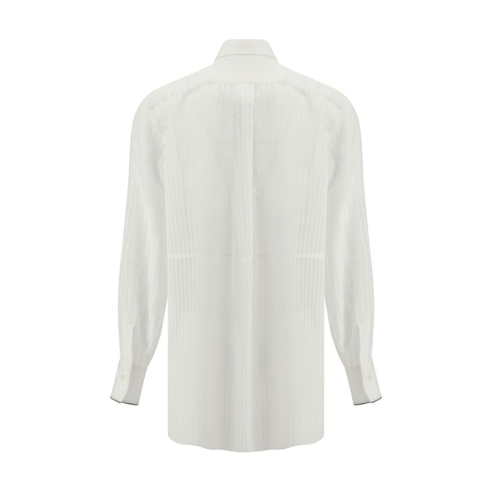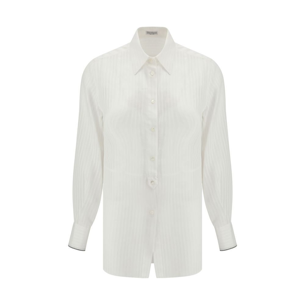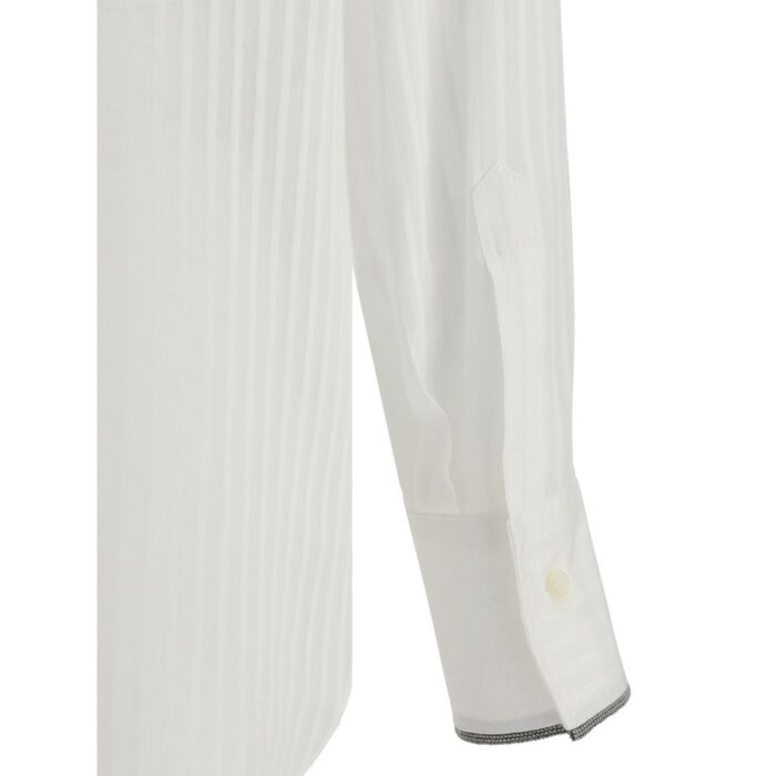 Cotton Shirt by Brunello Cucinelli featuring a classic collar, a front button fastening, an asymmetrical hem, button-adjustable cuffs with iconic shiny bead applique detail at hem, an all-over striped pattern, a semi-transparent design, and a regular fit.