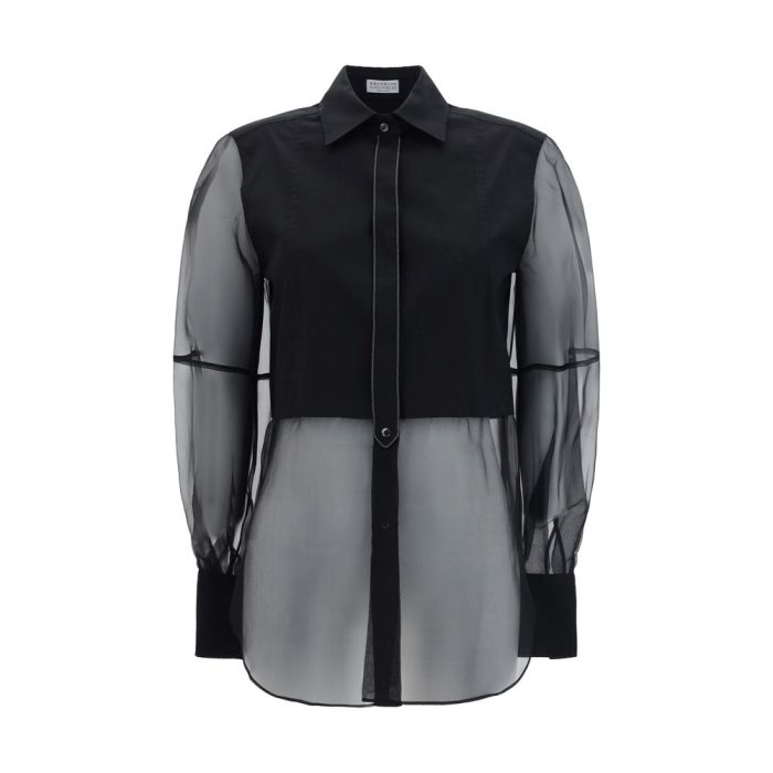 Cotone Shirt by Brunello Cucinelli featuring a classic collar, a front button fastening, a semi-transparent design, the brand’s iconic shiny jewel detail applied to front panel, a monochrome pattern, and a regular fit.