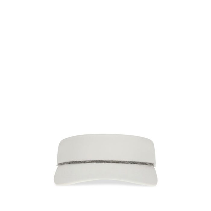 Nylon Visor with Shiny Band by Brunello Cucinelli combines functionality and elegance. The sporty design is embellished with a shiny band and a delicate nickel-free jewel decoration, adding a refined touch in the full style of the fashion house.