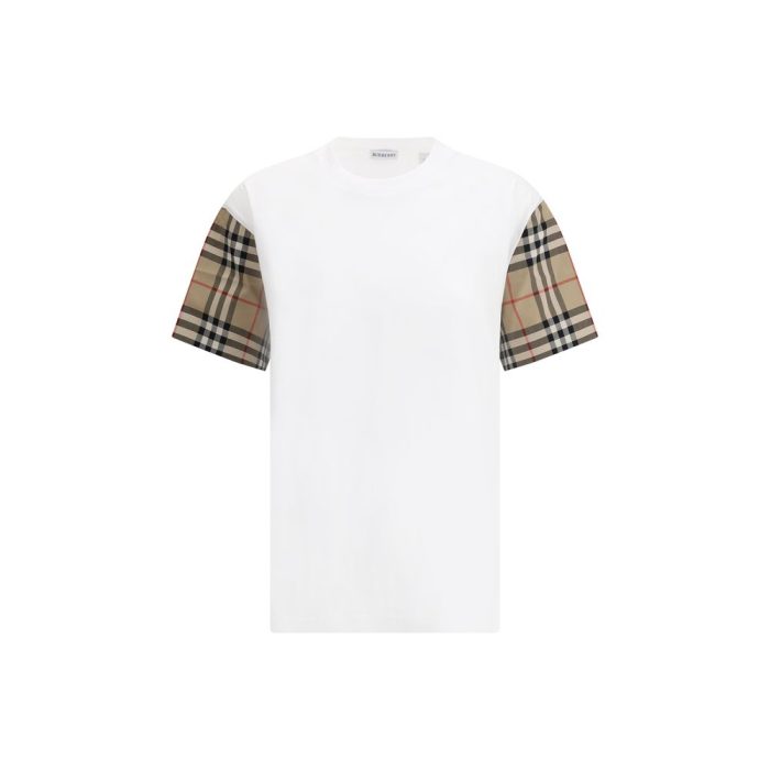 Burberry’s Cotton Check Archive Sleeve T-shirt is a garment that combines comfort with distinctive style. Featuring a ribbed collar, this T-shirt features sleeves embellished with the iconic Archivio Check pattern, one of the brand’s historic motifs. The simple, clean design of the T-shirt body highlights the sleeves with the famous pattern, creating a stylish and recognizable contrast.
