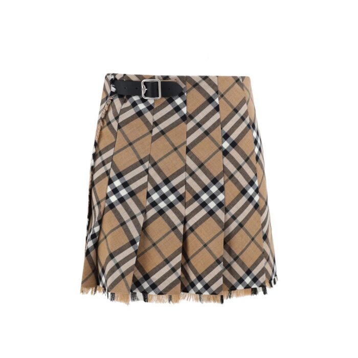 Wool Mini Skirt by Burberry featuring iconic Check Archivio pattern, pleated design, wrap-around closure with adjustable strap, frayed hems, regular fit.
