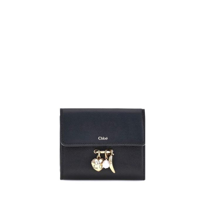 The Chloé Charms trifold Wallet, crafted from premium grained and shiny calfskin, combines elegance and practicality in a compact format. This small accessory features a dedicated compartment for banknotes, six convenient card slots and a back pocket, ideal for organizing all your essentials in style. The snap button closure ensures security and ease of use, making this wallet a refined detail for any occasion.