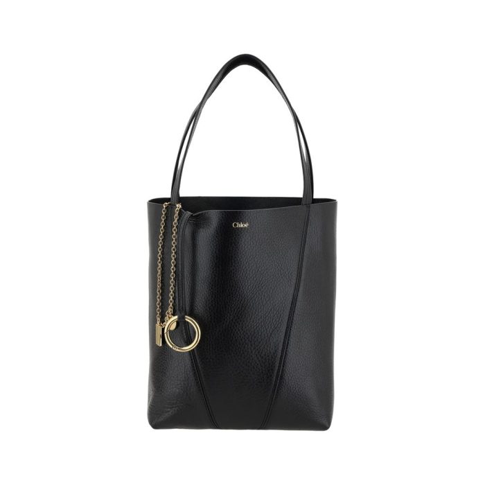 Leather Spin Shoulder Bag by Chloé is a refined and modern accessory featuring a sleek grained leather design. The two flat top handles offer a comfortable and practical grip, while the brand’s iconic monogram, press-stamped on the front, adds a distinctive touch of luxury. The closure of the bag is made via a ring that holds the two handles together, an element that gives it a unique and functional look. A fascinating detail is the chain with a pendant bearing the iconic logo applied to the handle. The interior of the bag consists of a single compartment.