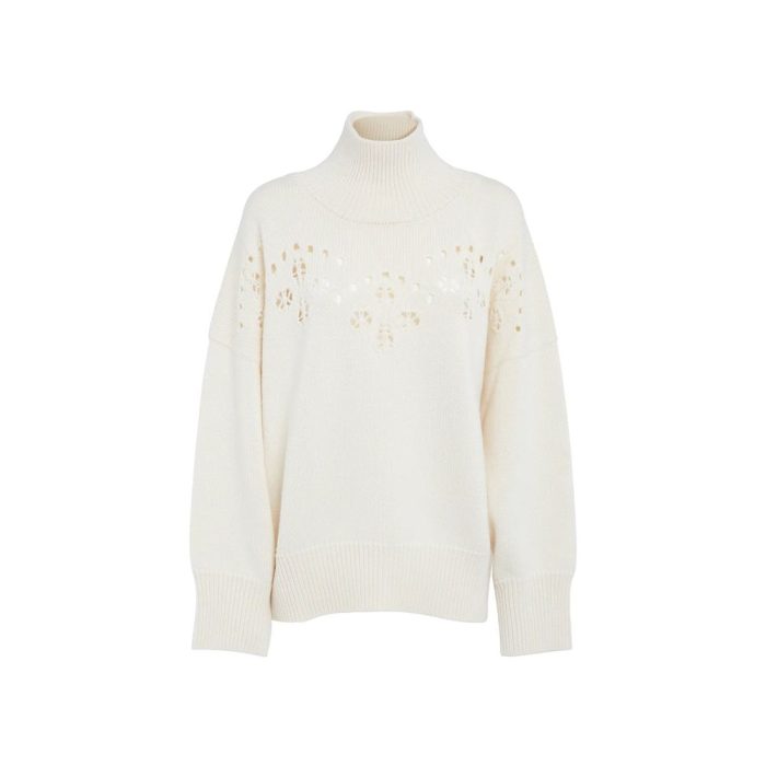 – Composition: 100% Wool – Long sleeves – Ribbed trims – Hand wash – High neck – Pointelle knit – Perforated detailing – Drop shoulder – Bishop sleeves – Made in Italy – Gender: WOMEN –