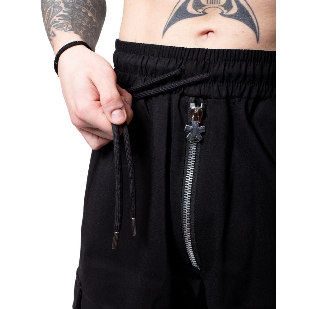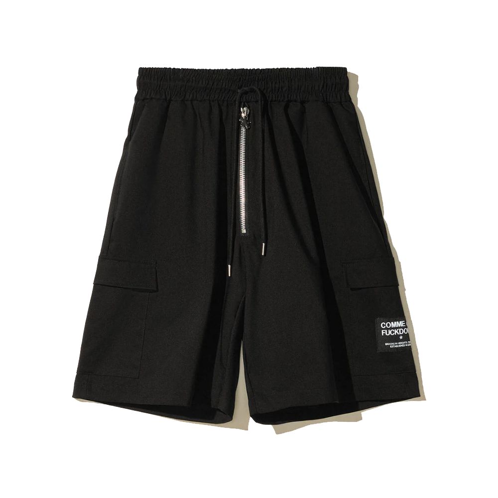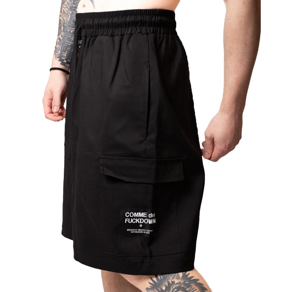 Comme des Fuckdown shorts in technical fabric and cotton, zip fastening, elasticated waist with drawstring, two side pockets and two cargo pockets with sewn-on logo patch