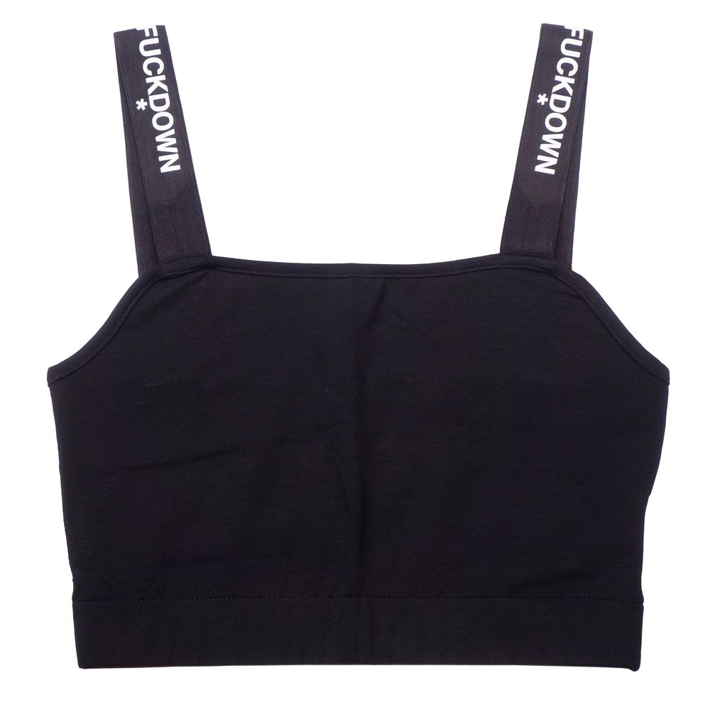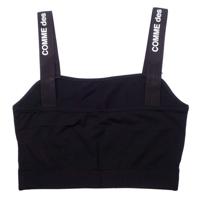 Comme des Fuckdown black cotton top with rubberised logo print elastic shoulder straps