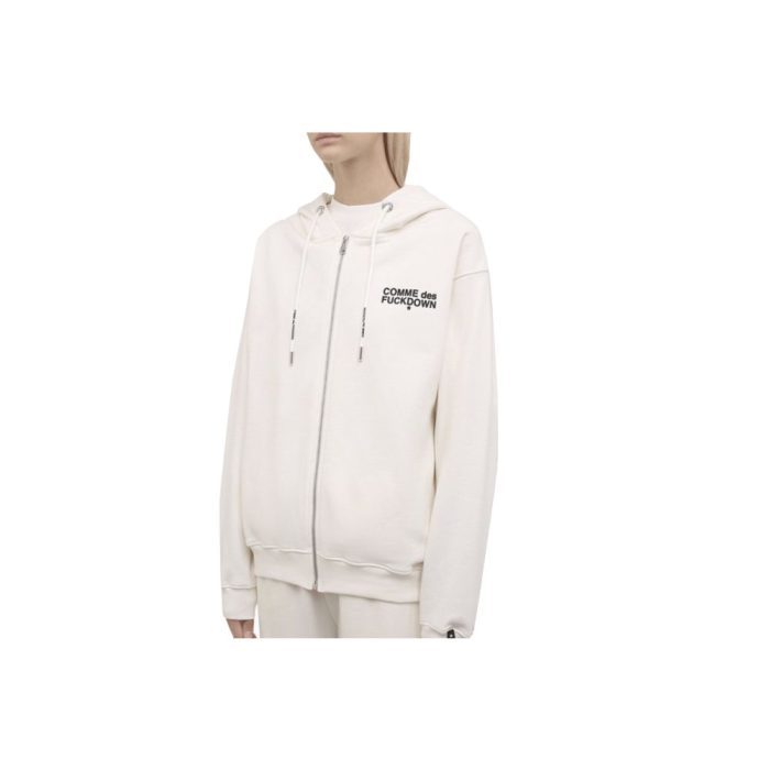 Comme des Fuckdown sweatshirt with hood and drawstring, logo print on the chest and zip closure. Made in Italy