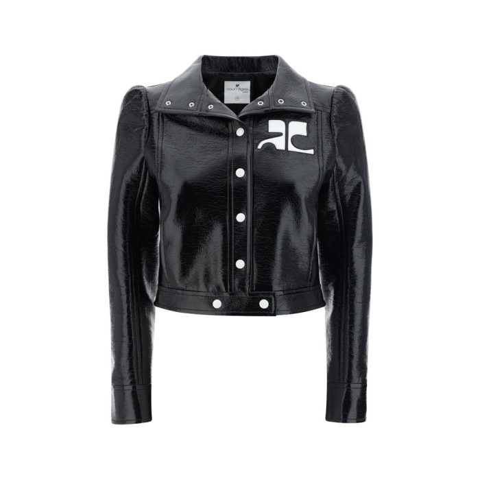 Courrèges’ Cotton Jacket combines boldness and contemporary style in a cropped model with a leather-effect design. Featuring a high collar and front snap-button closure, it has two side welt pockets for discreet functionality. The iconic logo on the front adds a distinctive and refined touch. Perfect for those looking for a jacket with a bold, modern character.