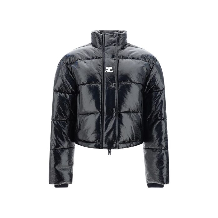 Crop Down Jacket by Courrèges, double-slider front zipper closure, high collar, all-over padded and quilted design, two zippered side welt pockets, elastic ribbed cuffs, regular fit, iconic contrasting brand logo on front.