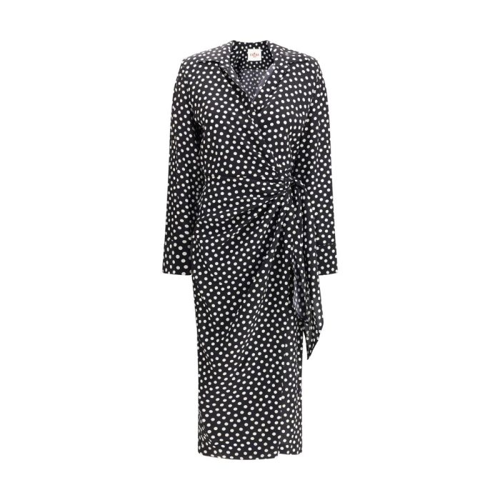 The Como Dress in Crêpe de chine by Crida Milano is a garment with sophisticated and feminine appeal. The wrap model, with its draping on the front, creates a fluid and enveloping effect that enhances the figure. The V-neckline adds a touch of sensuality, while the polka dot pattern gives a playful yet elegant character. The tie bow on the left hip introduces an element of originality, gently emphasizing the silhouette. An elegant drape created by a side stop at the waist gives the dress an unprecedented and refined note, making it perfect for special occasions or a sophisticated daytime look. The crepe de chine fabric adds a touch of luxury and comfort, making this dress a true classy wardrobe piece.