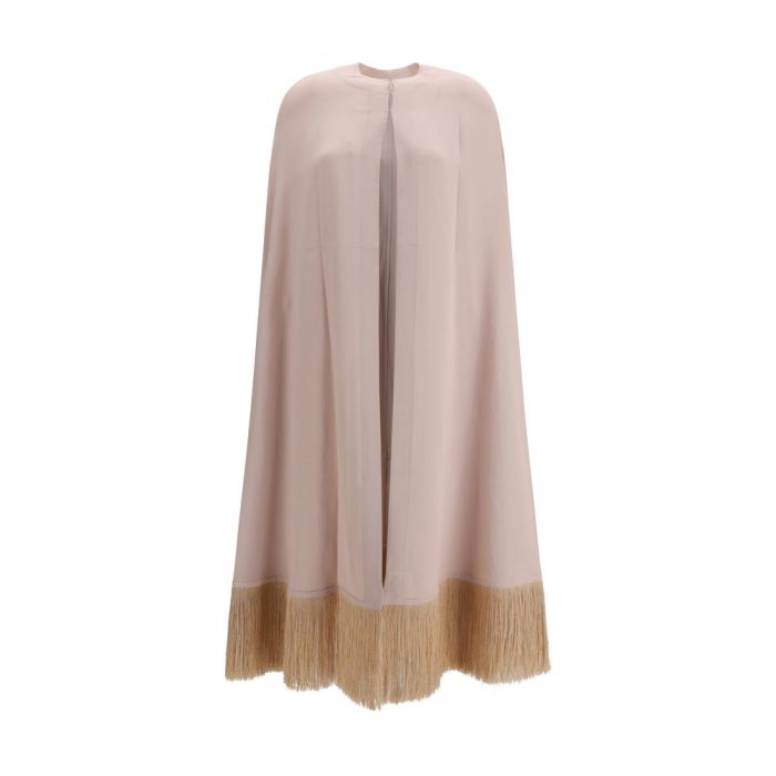 The Deco crepe Cape by Di Stavnitser creates a striking visual effect through an open and fluid construction that drapes effortlessly over the body. Three small hook fastenings at the upper neckline, reminiscent of lingerie closures, keep the piece joined only at the top. From that point, the cape opens fully into two long, separate panels, allowing the silhouette to move freely. Fringed hems enhance motion, turning the cape into a bold and contemporary statement.