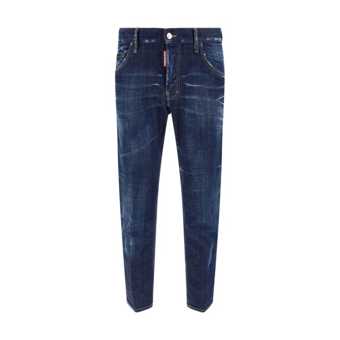 Cotton Skater Jeans by Dsquared2, five-pocket straight style, front button and zipper closure, belt loops for waistband, iconic leather patch with brand signature pressure-printed applique on back.