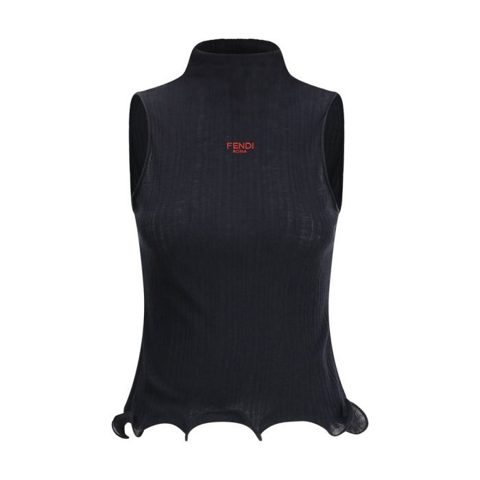 The sleeveless Virgin Wool Top by Fendi is a timeless piece that blends refined simplicity with iconic details. Crafted from ribbed Virgin Wool, it features a fitted silhouette with a high neck, enhancing the figure with understated elegance. Delicate ruffles at the hem bring a feminine touch, while the embroidered Fendi Roma lettering on the chest adds a subtle signature of exclusivity.