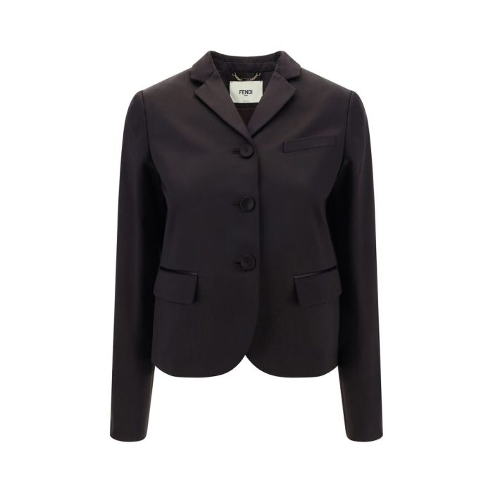 Cotton Blazer Jacket by Fendi, front button fastening with matching buttons, slight classic lapels, two welt pockets with side flaps, one front welt pocket, back vent, structured shoulders, satin finish, iconic tone-on-tone embroidered brand monogram on left sleeve, regular fit.