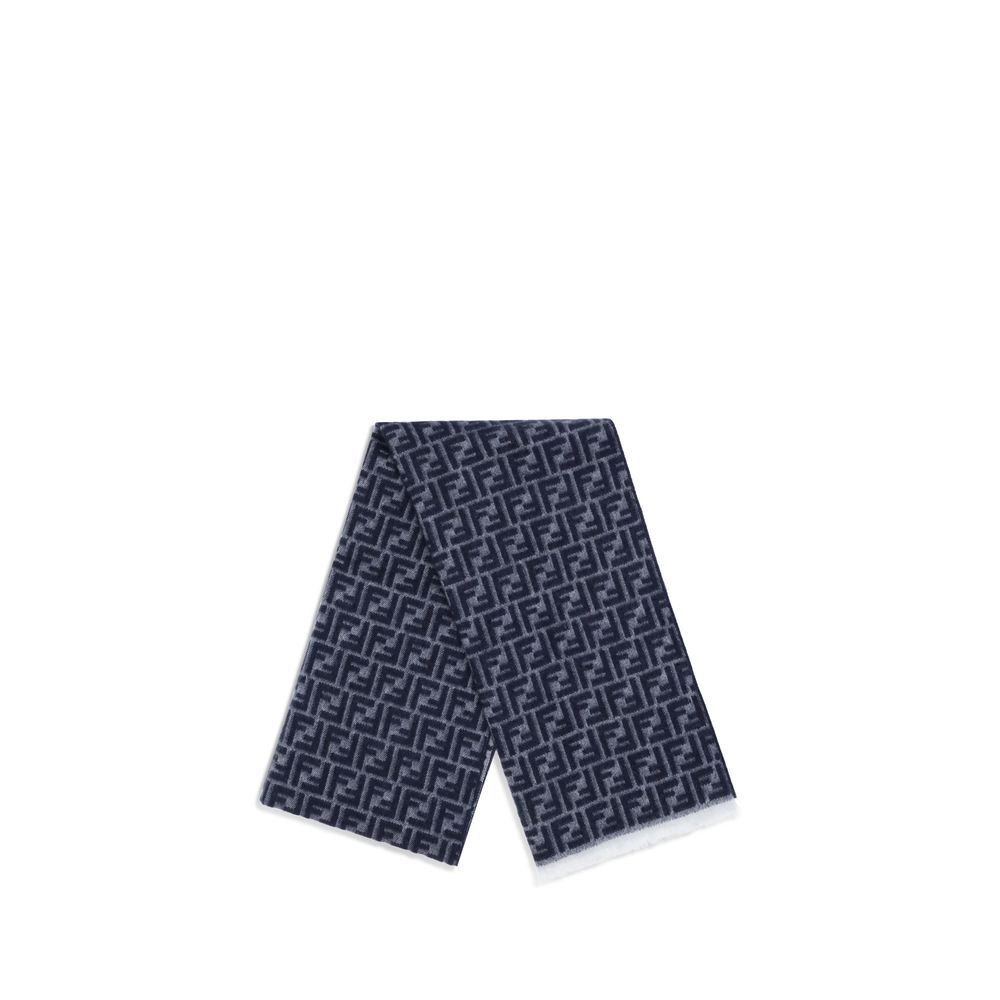 The FF wool Scarf by Fendi is made of FF micro jacquard in shades of light gray and blue, with an elegant and versatile rectangular design. Small white bangs at the ends add a refined touch that complements its distinctive style.