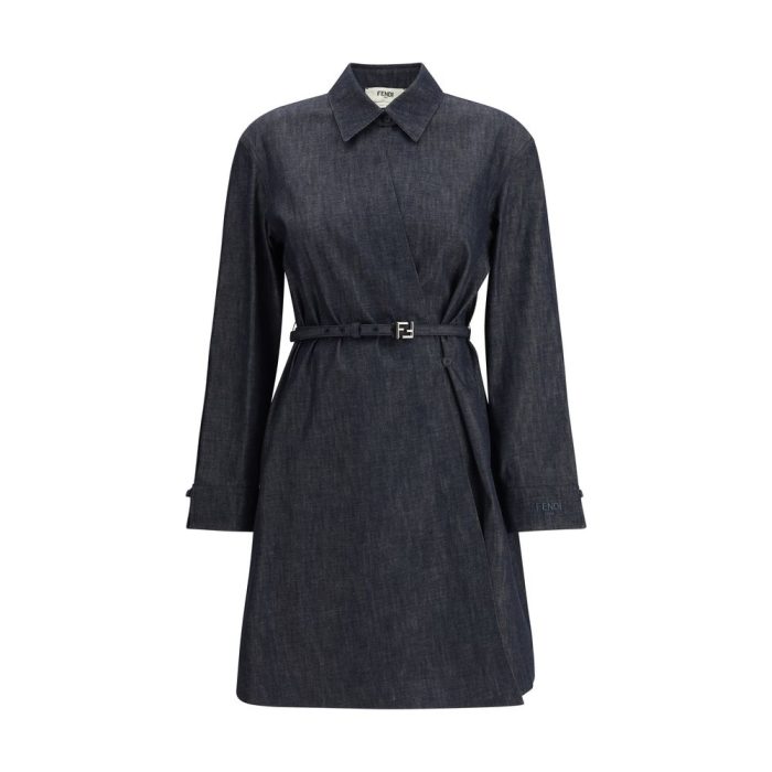 Fendi’s chambray Dress is a short straight-cut chemisier designed for a casual yet sophisticated look. Made from ultralight chambray denim, it features a shirt-style collar and cuffs that accentuate its versatility. The asymmetrical crisscross closure with small side button creates an elegant drop detail at the neckline. A distinctive touch is the matching embroidered logo on the left sleeve hem, which adds an understated sign of personality.