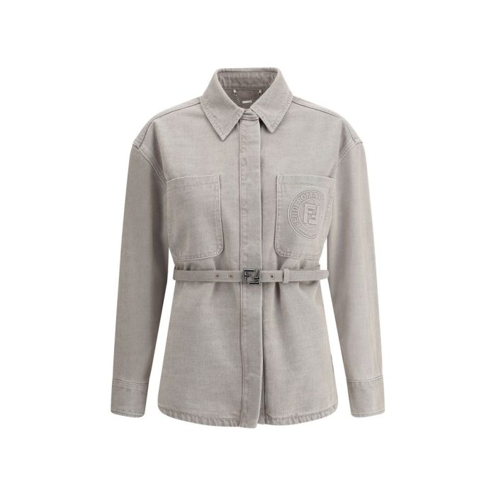 Fendi’s denim-designed cotton Jacket features a classic collar and front button closure. It is enhanced by two slit patch pockets on the front with iconic embossed monogram detail. Two side welt pockets and side slits add practicality and style. An adjustable and removable applique belt completes the look, allowing you to customize the fit.