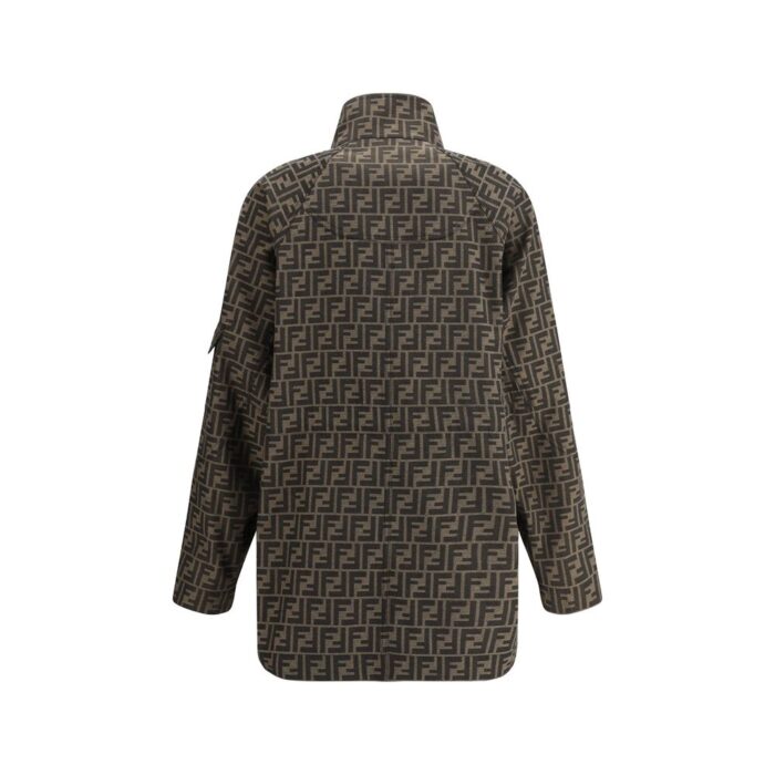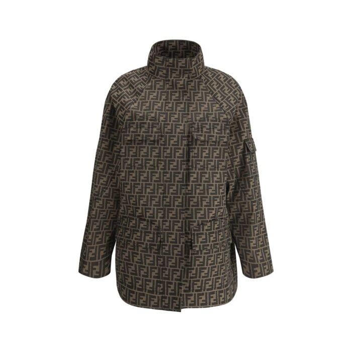 Fendi’s FF Print Jacket is an item that embodies the brand’s bold and sophisticated style, perfect for those looking for a distinctive and trendy look. Featuring a high collar, this jacket offers a touch of elegance and protection, making it ideal for the colder seasons. The front button and zipper closure provides practicality and a secure fit, while the four front patch pockets with flaps offer functionality and a stylish accent. An additional distinctive detail is the patch pocket on the left sleeve with flap. The iconic all-over FF logo lends a recognizable and modern touch of luxury, making this jacket a must-have for those who love the mix of comfort, practicality and high fashion.