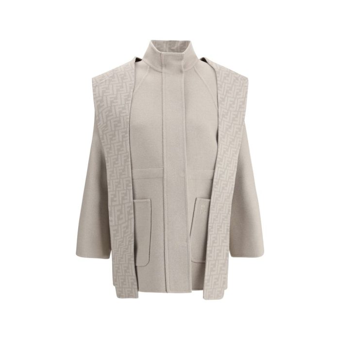 Fendi’s wool Coat is a stylish and versatile garment perfect for tackling the winter season in style. The removable hood and scarf add an extra touch of warmth and can be easily detached to fit different needs. The front zipper and button closure provides practicality and security, while the high collar protects from the cold, creating a sleek silhouette. The two patch pockets on the front complete the design, offering functionality and a touch of sophistication.