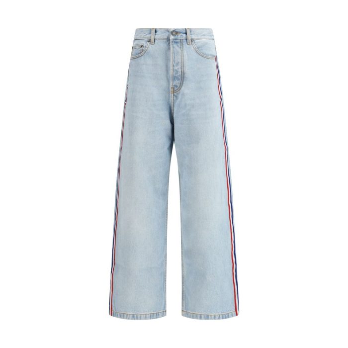 The Tricolor Stripe Baggy Jeans by Fiorucci stand out with bold red, white and blue stripes running along the outer seams. Featuring a mid-rise baggy silhouette, 5-pocket construction, waistband with belt loops and button fly closure, they are crafted from premium non-stretch denim, blending bold character with contemporary style.