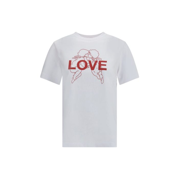 The Kissing Angels Love Print Regular T-Shirt by Fiorucci in white reimagines the brand’s iconic Kissing Angels graphic, first seen on collectible Panini cards, layered with bold Love lettering and the Fiorucci logo. Crafted from lightweight cotton jersey, it features a regular fit, short sleeves, and a crewneck, blending comfort with a playful, cultural statement.