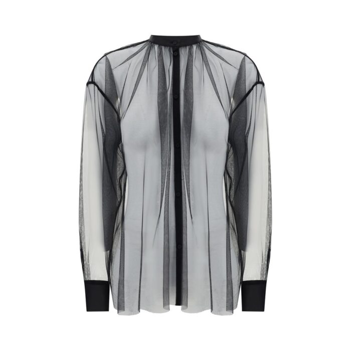 Bohemienne Shirt by FORTE_FORTE, semi-transparent effect tulle design, mandarin collar, front button closure, silk effect cuffs, monochrome pattern, regular fit.
