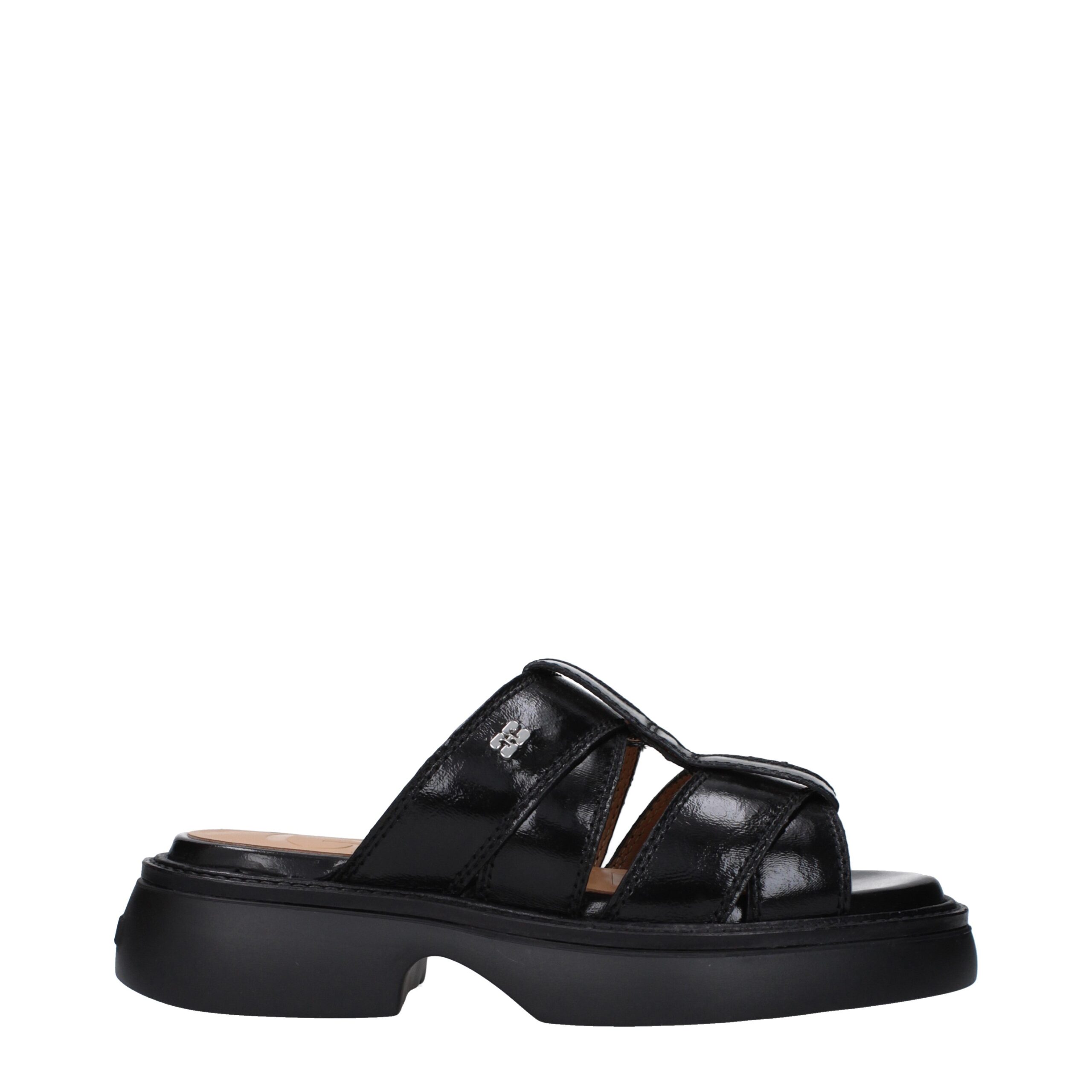 The product with MPN S26234914099 and code F82886 fabric in black is a slippers and clogs designed by Ganni. It has features like side logo, back logo.