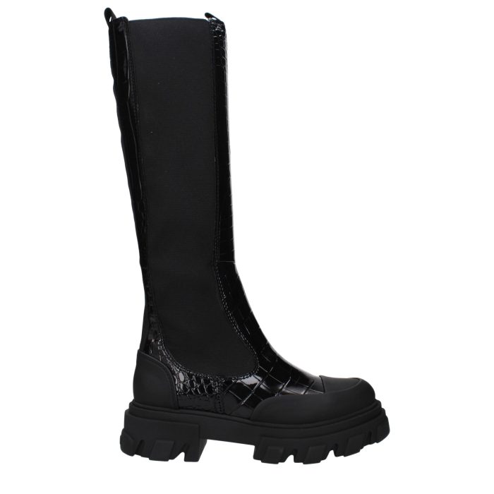 The product with MPN S27774900099 and code F82917 leather in black is a boots designed by Ganni. It has features like back logo.