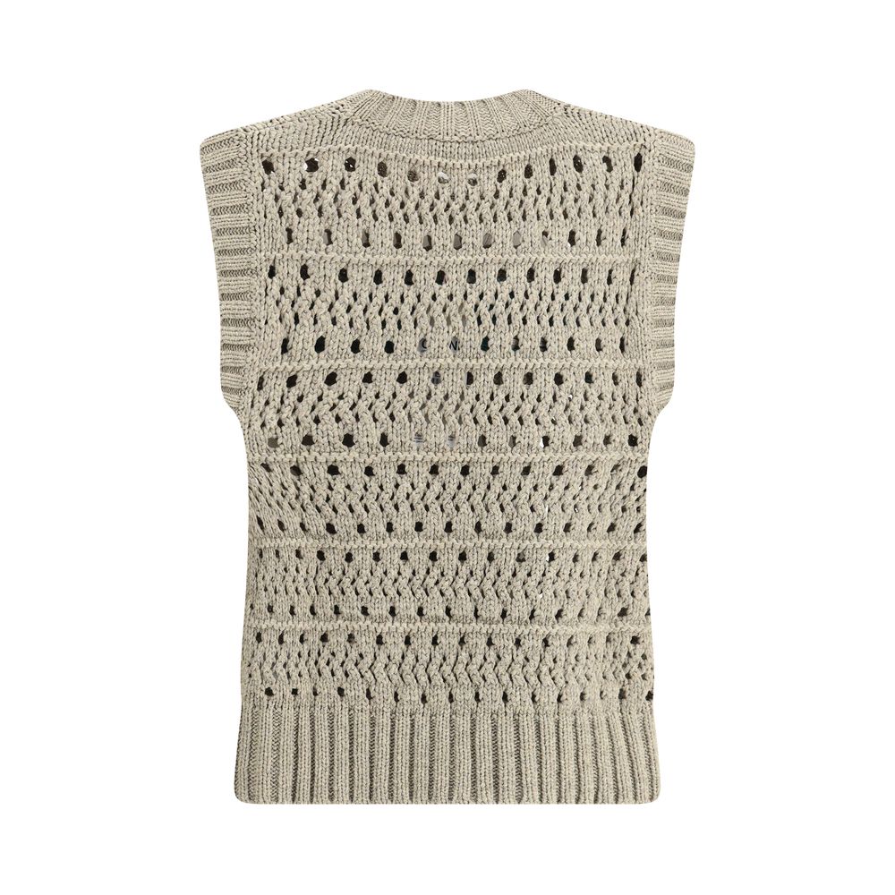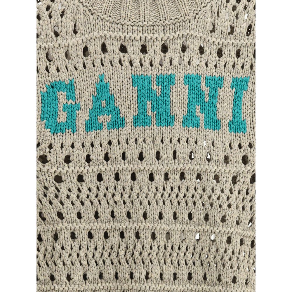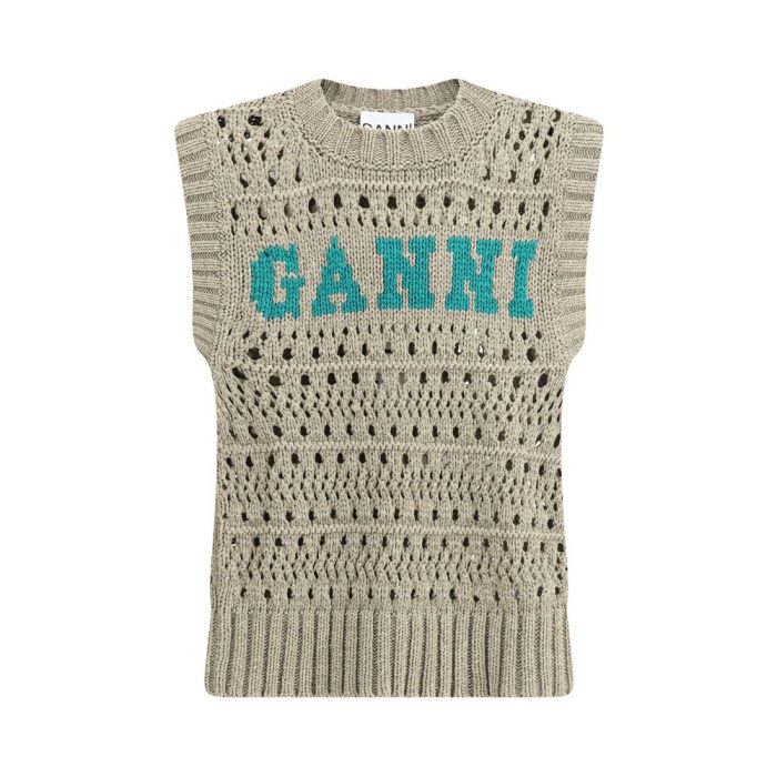 Cotton Vest by Ganni, made of perforated knit with a lightweight and contemporary design. It features ribbed crew neck, high ribbed hem and the iconic monogram printed in contrast on the front. A garment with a playful and distinctive character, perfect for original layering.