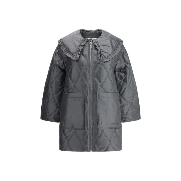 Ganni’s Jacket features a wide classic collar and a front zipper closure. The oversized design features raglan sleeves and a quilted pattern throughout. Two maxi welt pockets stand out on the front, enhanced by the iconic tone-on-tone monogram detail, which adds a distinctive touch to the garment.