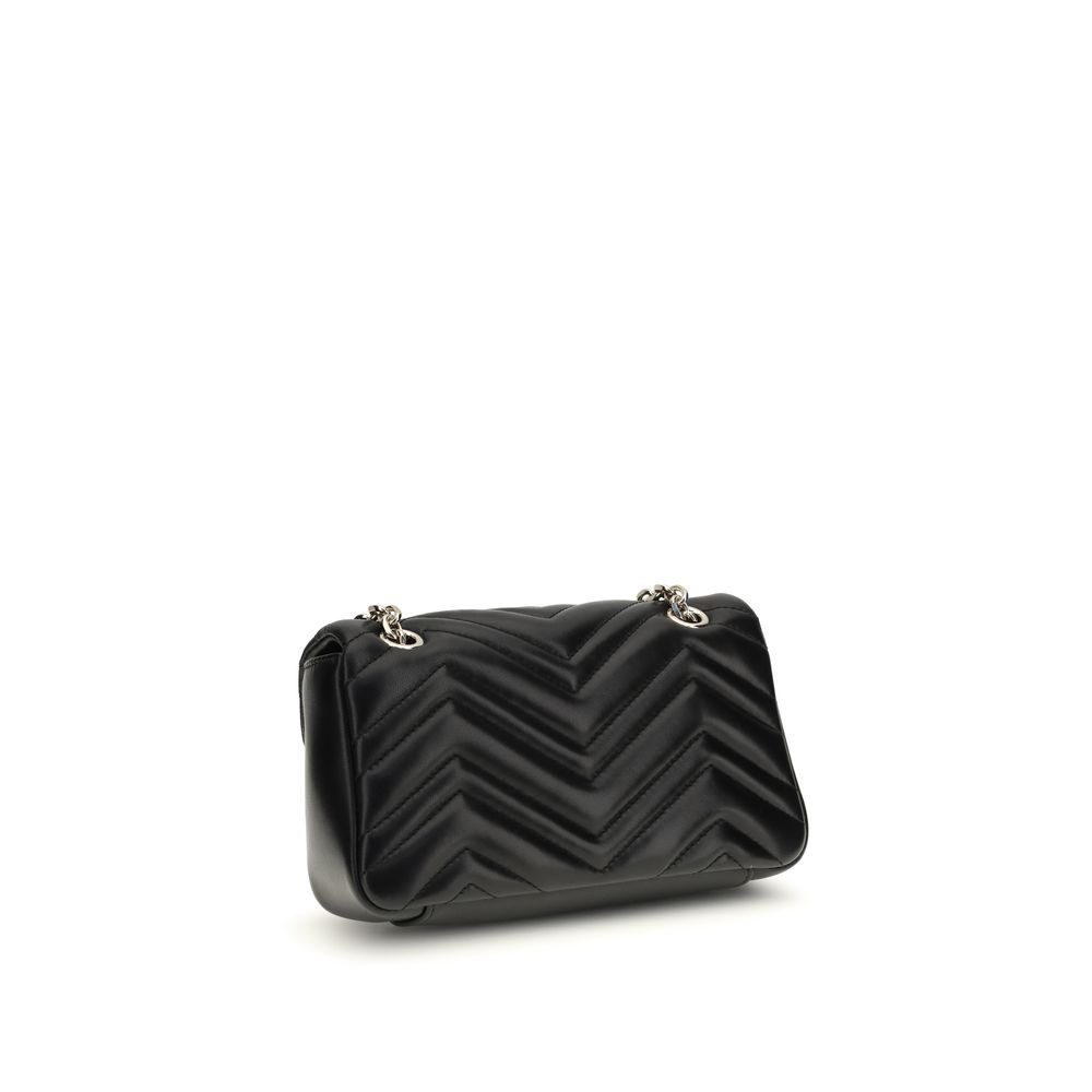 The GG Marmont small Shoulder Bag by Gucci is a classic reinterpreted with contemporary elegance. Made of black matelassé lambskin leather in a chevron pattern, it is enhanced by light gold hardware details and Gucci Red Ancora viscose lining. The spring-loaded flap protects items, while the interior features a zippered pocket and the exterior an open pocket. The sliding chain strap allows it to be carried comfortably on the shoulder with a 22-cm drop, making it versatile and perfect for any occasion.