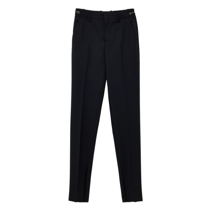 In black, straight fit, front fastening with hook and covered zip, two side welt pockets, two back pockets, straight leg and two internal slits on the bottom. On the sides at the waist iconic metallic details.