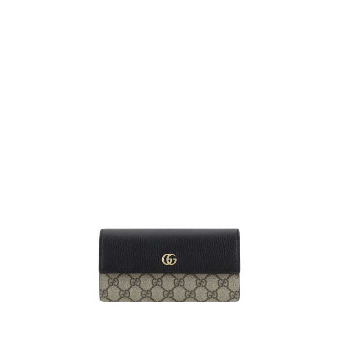 Leather Wallet by Gucci, front closure by leather magnetic flap, all-over printed iconic GG Supreme logo, metal plaque with iconic brand logo applied on the front, interior bill compartment, card slot, zippered coin pocket for closure.