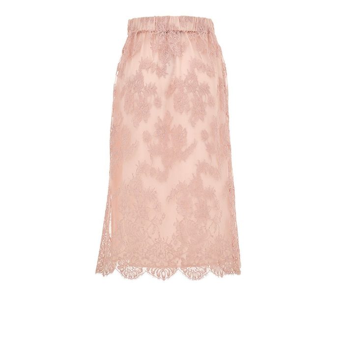 Elastic waist, skirt composed of a removable pink lining, two small slits on the sides. Tube model, medium length, floral motif on the lace