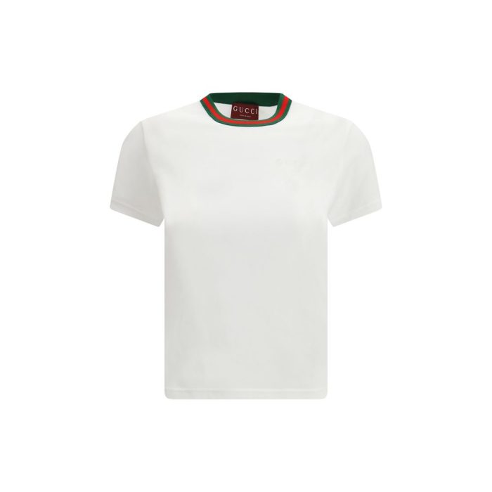The cotton jersey T-shirt by Gucci reflects the evolution of the Maison’s codes through a relaxed and contemporary attitude. The lightweight jersey shapes the short-sleeve silhouette with a classic crew neckline, while the embroidered Gucci logo patch is complemented by Web-inspired trims, creating a piece with an instantly recognizable and effortless identity.
