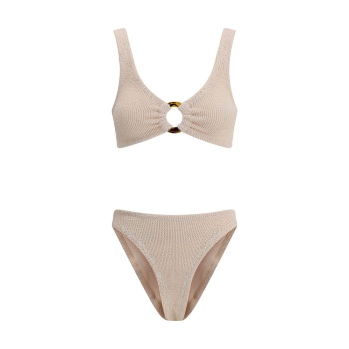Hunza G’s Julia Swimsuit is ideal for those seeking a sophisticated, modern look. The bikini style consists of a low-rise bottom and an off-the-shoulder top, enhanced by a cut-out detail with a tortoiseshell ring on the front, which adds a distinctive style touch. The unique Original Crinkle fabrication allows the fabric to stretch to flex, sculpt and support every curve, fitting all body types perfectly, ensuring a unique fit.
