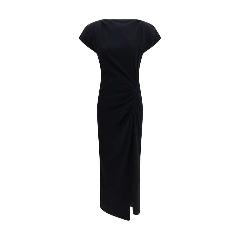 The Nadela Dress by Isabel Marant is crafted in cotton jersey and defined by a clean yet expressive silhouette. The boat neckline highlights the shoulders, while the removable snap-button straps offer versatility in styling. Short sleeves with turned-up cuffs add a casual note, balanced by the front pleating and slit that introduce movement and subtle sensuality. Long and body-skimming, this dress embodies a relaxed elegance with a contemporary edge.