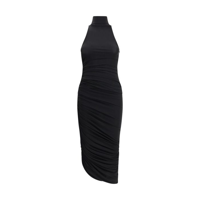 The La Piazza midi Dress by Jacquemus features a high neck and ruched details that give movement to the garment. Sleeveless and sleeveless, it features an asymmetric hemline that adds a modern and sophisticated touch to this elegant and contemporary design.