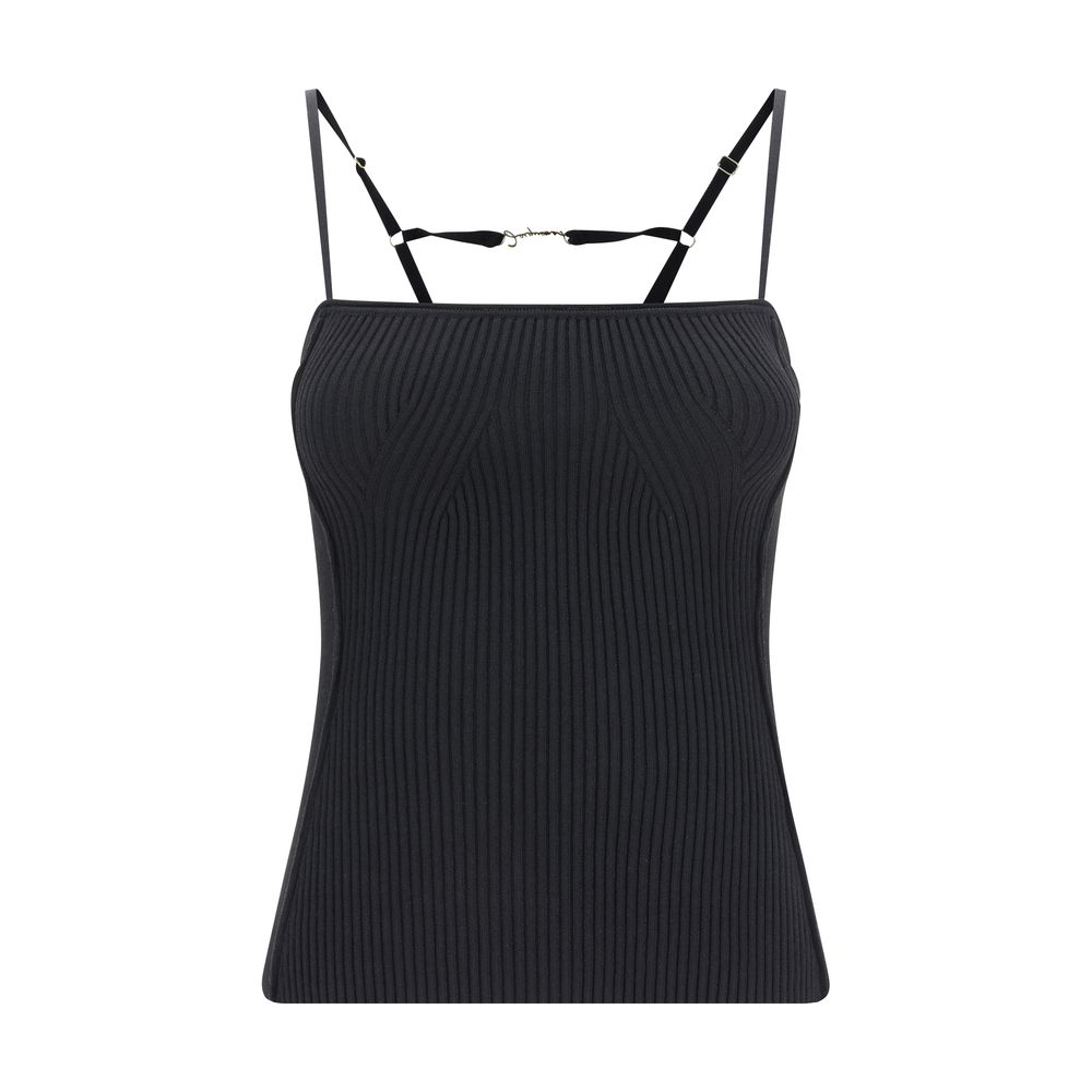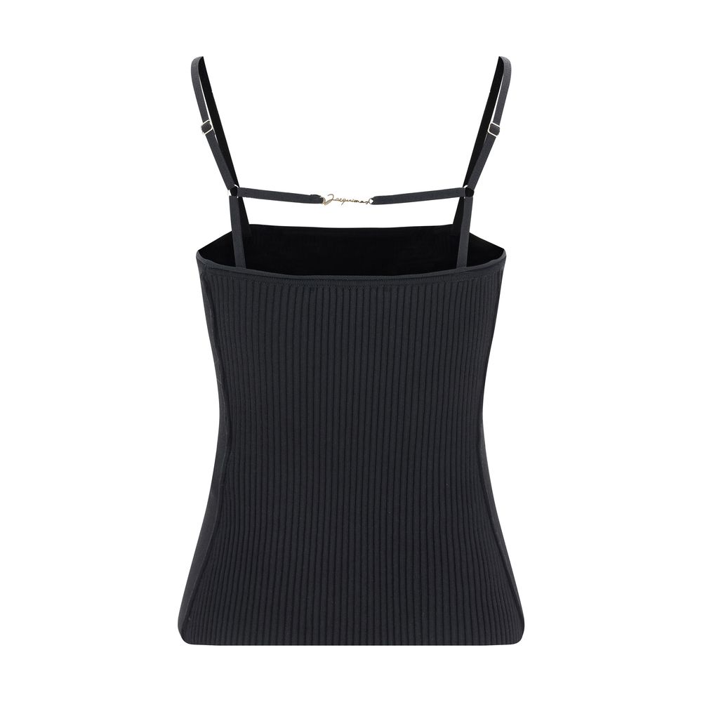 Le Haut Sierra Top by Jacquemus, sleeveless design, thin shoulder straps, iconic brand signature plaque on back, ribbed design, monochrome pattern, close fit.