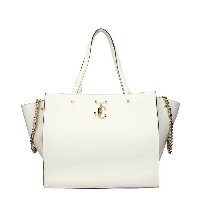 The product with MPN AVENUEDAWLATTELIGHT and code F85115 leather in white is a shoulder bags designed by Jimmy Choo. It has features like front logo, back logo, studs, removable details.