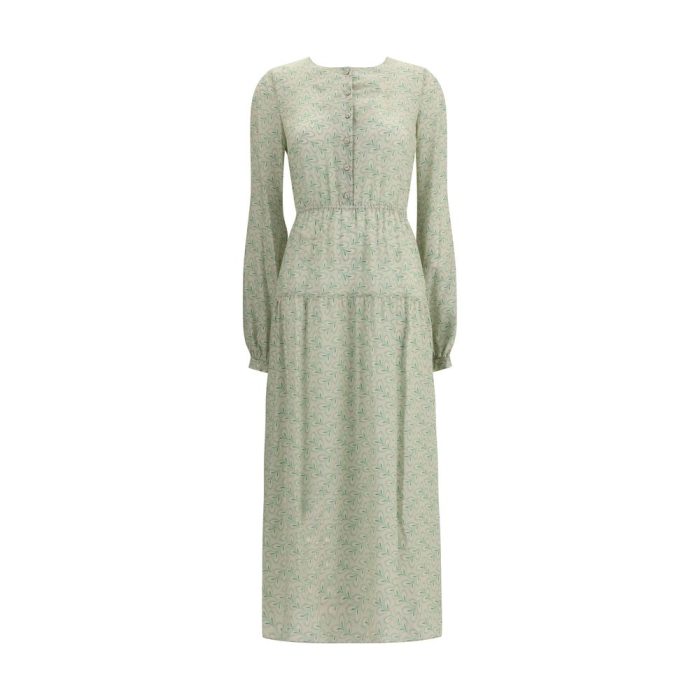 Kristina Ti’s Silk long Dress is a fluid and feminine garment enhanced by a delicate foliage print. The mid-bust button closure gives a discreet and elegant touch, while the elasticized waist enhances the silhouette naturally.