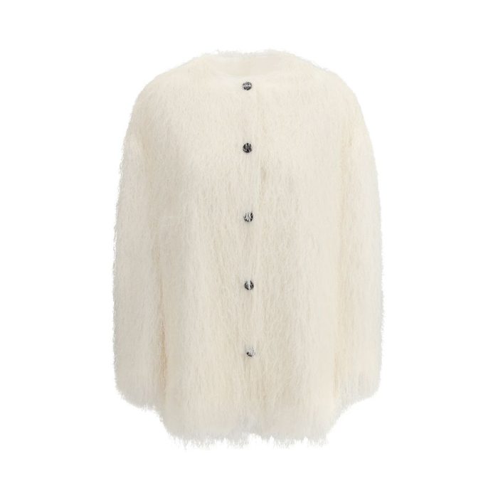 The Filippo fringed Coat by Loulou de Saison is crafted from a distinctive fringed fabric that adds texture and movement to the design. Defined by softly rounded lines and a short, generous fit, it features a clean collarless neckline and a five-button front closure. The result is a cocoon-like silhouette that feels both modern and enveloping, perfect for effortless layering with a refined, contemporary attitude.
