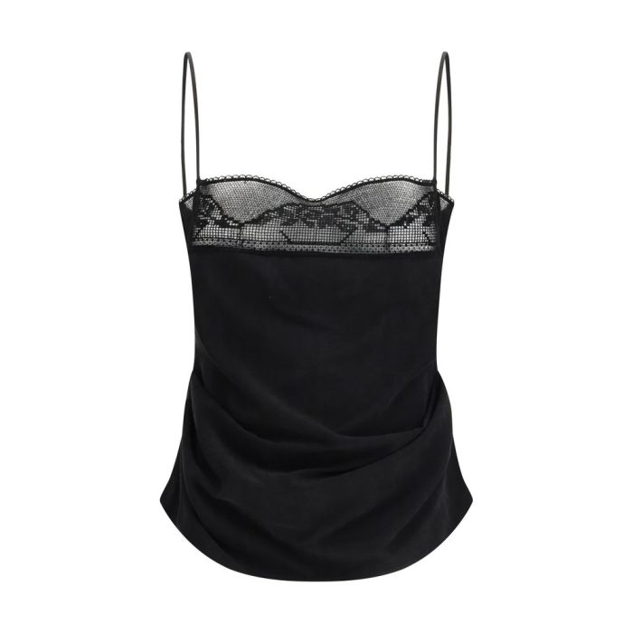The silk draped Top by Magda Butrym with lace is a delicate and refined garment, made from soft, slightly shiny silk. The thin straps support the straight neckline, embellished with sheer floral lace that adds a touch of sensual elegance. The draped side pleats create a soft, sculptural silhouette that delicately enhances the figure. Finished with a hidden zipper at the back, this top combines sophistication and femininity in a timeless design.