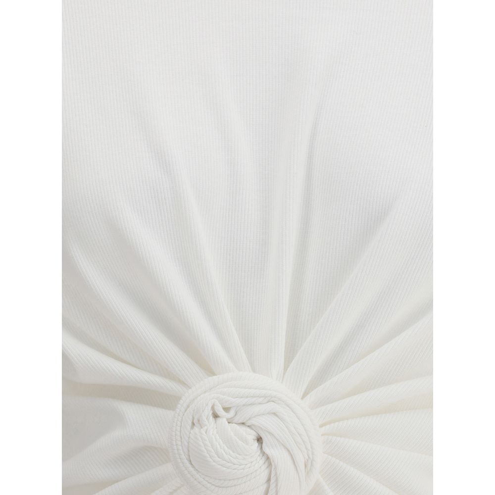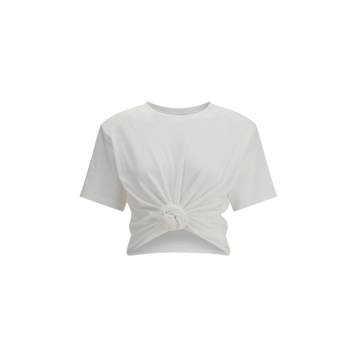 Magda Butrym’s T-Shirt is a versatile and feminine piece featuring a classic crew neck and a ribbed design that enhances the silhouette. The rose flower detail and drape on the front add a touch of originality and sweetness, making it perfect for casual yet sophisticated looks.