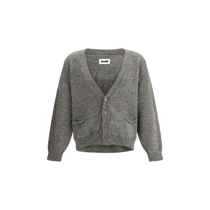 Magliano’s wool Cardigan is a piece with an authentic, handcrafted character. Made from Shetland yarn, it features a V-neck, button closure, and ribbed cuffs and hem for a structured fit. Two patch pockets on the front add functionality, while the logo on the back signs the garment with a distinctive touch.