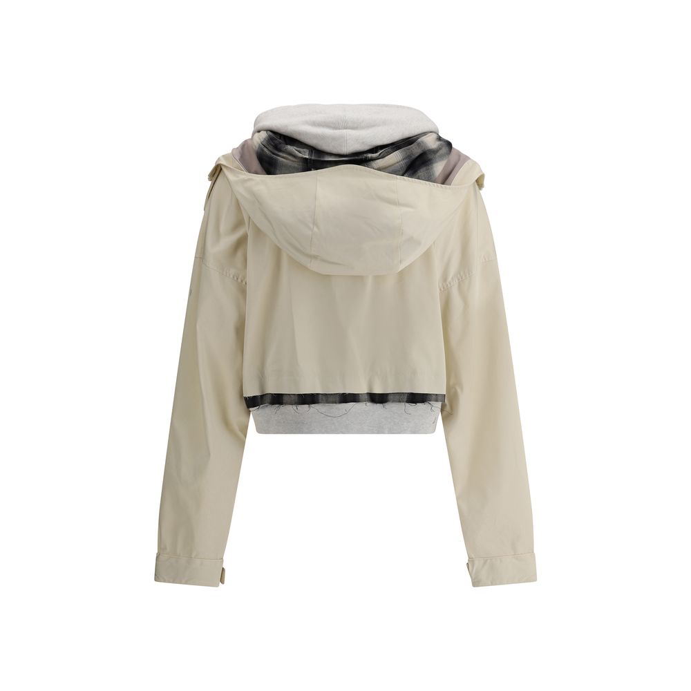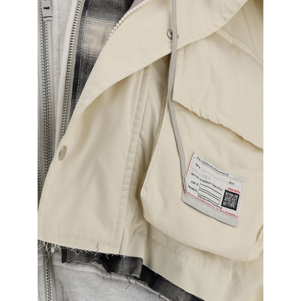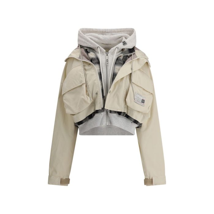 Maison Mihara’s Jacket is a garment with a bold, contemporary style. The cropped model with a layered patchwork design stands out for its experimental, layered aesthetic. Equipped with a hood and front zipper and snap closure, it features two front patch pockets with flaps and a logo patch that signs the brand’s identity with character.