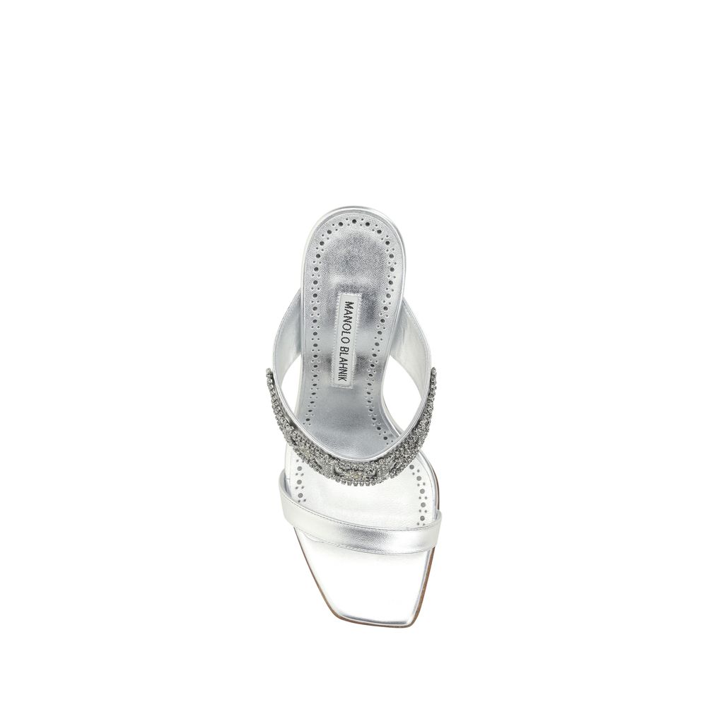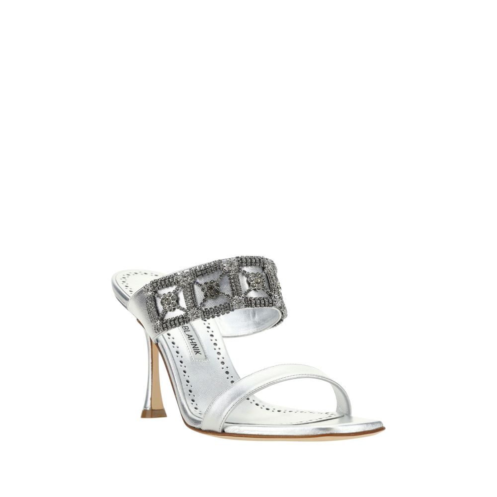 Calfskin Larapa Sandals by Manolo Blahnik, featuring a leather stiletto heel, a double front strap with shiny jewel detail, a branded insole, and an open almond toe at the front.