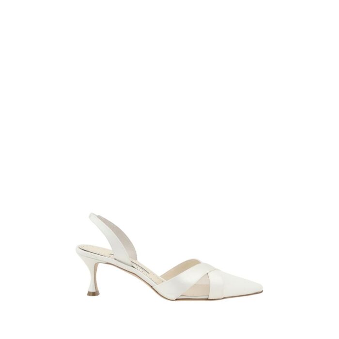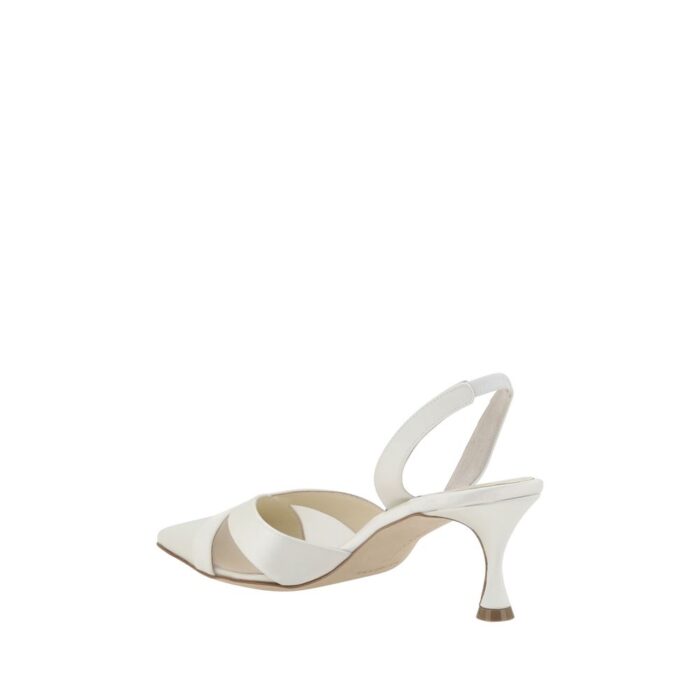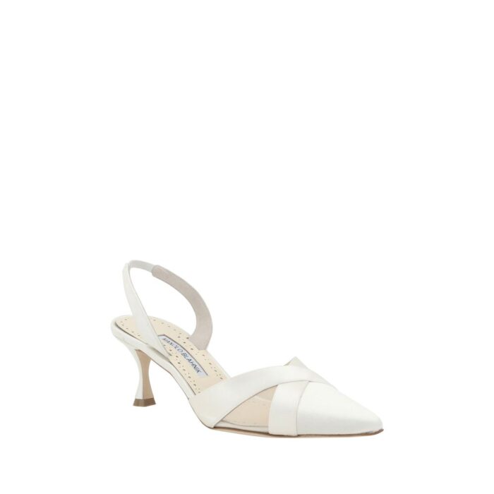 Satin Oyounak Pumps by Manolo Blahnik featuring an elongated toe with mesh detailing on side panels, an elasticized slingback, a leather stiletto heel, and a logo-embossed insole.