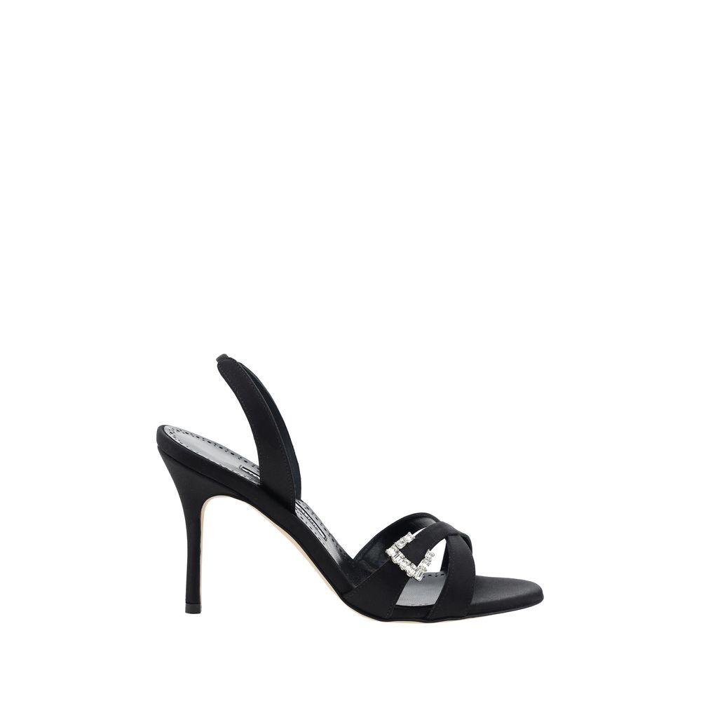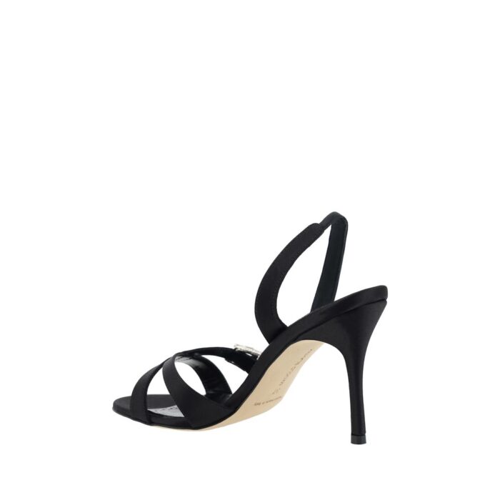 Silk Satin Ramisli Fabio Sandals by Manolo Blahnik, feature an elasticized slingback, two crisscross front straps with applique shiny plaque detail, a logo-embossed insole, and a leather stiletto heel.