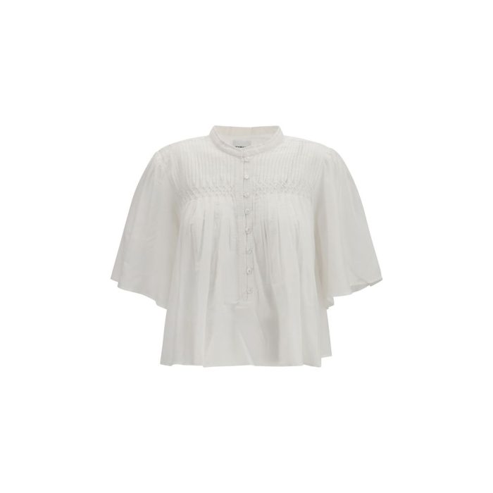 The cotton Shirt by Marant Étoile embodies a romantic and airy style, defined by its pleated design that adds movement and femininity. The round neckline and dropped shoulders create a soft, relaxed silhouette, while the short sleeves complete the look with effortless ease. The front button closure and straight hem finish the piece, making it a versatile option for refined everyday outfits in a solid color.